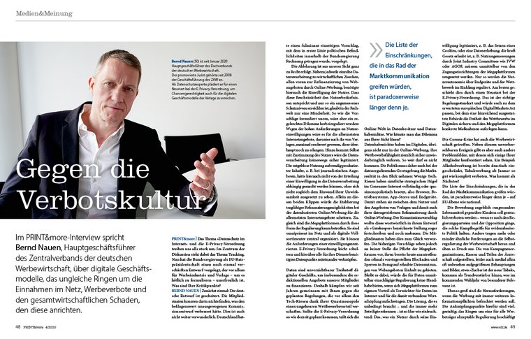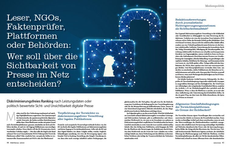 „Wer soll über die Sichtbarkeit von Presse im Netz entscheiden?“, fragt Prof. Christoph Fiedler vor dem Hintergrund der EU-Gesetzgebung zum Digital Markets Act in seinem medienpolitischen Beitrag dieser Ausgabe. Auch Werbeverbote im digitalen Umfeld begrenzen die Geschäftsmodelle von Verlagen. Wie Chancengerechtigkeit gegenüber den Online-Megaplattformen zu erreichen seien, darüber äußert sich Bernd Nauen, Hauptgeschäftsführer des Zentralverbands der deutschen Werbewirtschaft, im Interview mit PRINT&more.