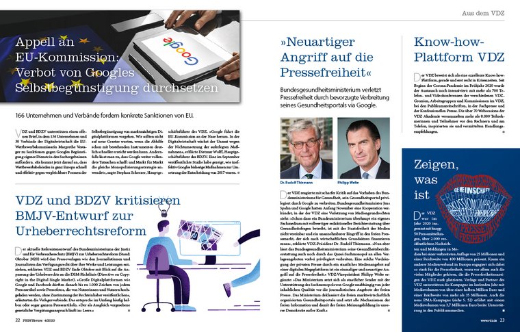 Die Sichtbarkeit digitaler Verlagsangebote hat sowohl für redaktionelle Inhalte als auch die Werbewirtschaft hohe Priorität. Chancengleichheit im Wettbewerb mit den digitalen Megaplattformen zu erreichen, ist für die Branche fundamental. Als „neuartigen Angriff auf die Pressefreiheit“ beschreibt VDZ-Präsident Dr. Rudolf Thiemann die Kooperation des Gesundheitsministeriums mit dem Internetmonopolisten Google, denn sie diskriminiert die Verlagsangebote. VDZ-Hauptgeschäftsführer Stephan Scherzer spricht im Interview über die aktuelle Lage der Zeitschriftenbranche und die Perspektiven im verschärften Wettbewerb.