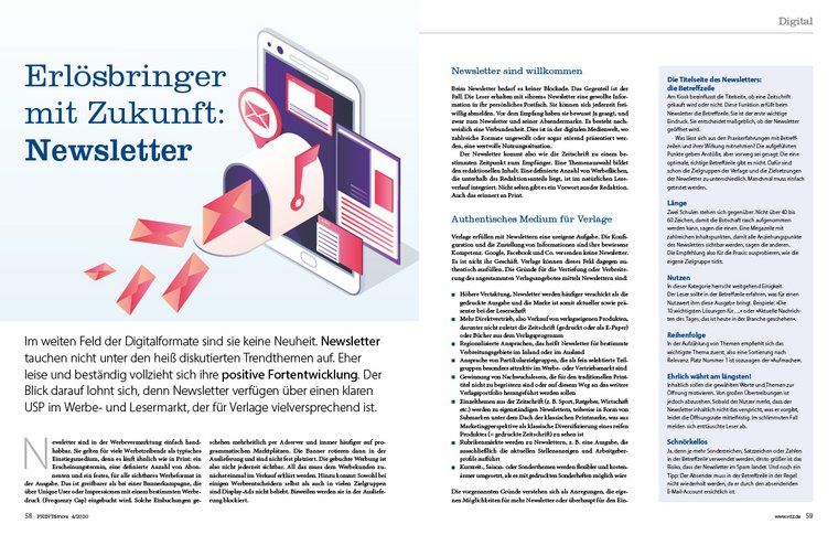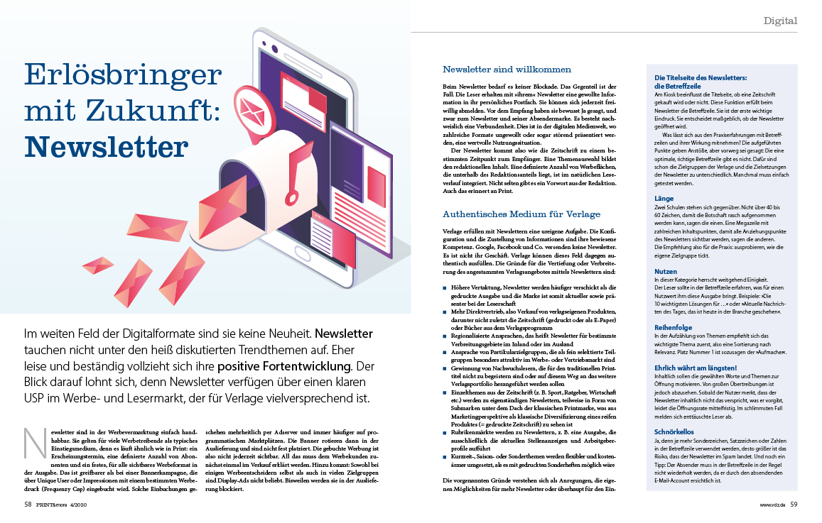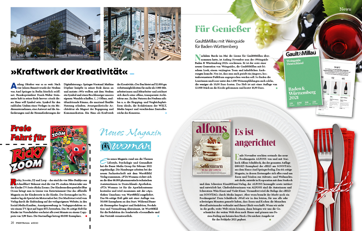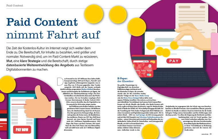Das Interesse der Menschen an fundierten journalistischen Informationen und unabhängiger Berichterstattung ist in den vergangenen Monaten in allen Segmenten enorm gestiegen. Insbesondere vor dem Hintergrund der Verluste im Anzeigen- wie im Konferenzgeschäft stimmt das positiv. Ebenso wie die stärkere Bereitschaft, auch für Digitalangebote zu bezahlen. Auf zehn Seiten steht das Thema Paid Content im Fokus, mit Strategien und Praxisbeispiele für erfolgreiche Erlösmodelle im digitalen Umfeld. Stefan Ottlitz, Geschäftsführer SPIEGEL-Verlag, stellte auf dem VDZ Distribution Summit fünf Leitlinien für die Paid-Content-Strategie vor. Im Beitrag „Paid Content nimmt Fahrt auf“ beleuchtet PRINT&more verschiedene Ansätze für Bezahlmodelle, berichtet über aktuelle Marktentwicklungen und liefert Tipps für den Einstieg in den Paid-Content-Markt. Die aktuelle VDZ-Studie „Verlagstrends 2020“ informiert zudem über die Chancen externer Paid-Content-Plattformen und gibt Handlungsempfehlungen für neue Geschäftsmöglichkeiten der Branche.