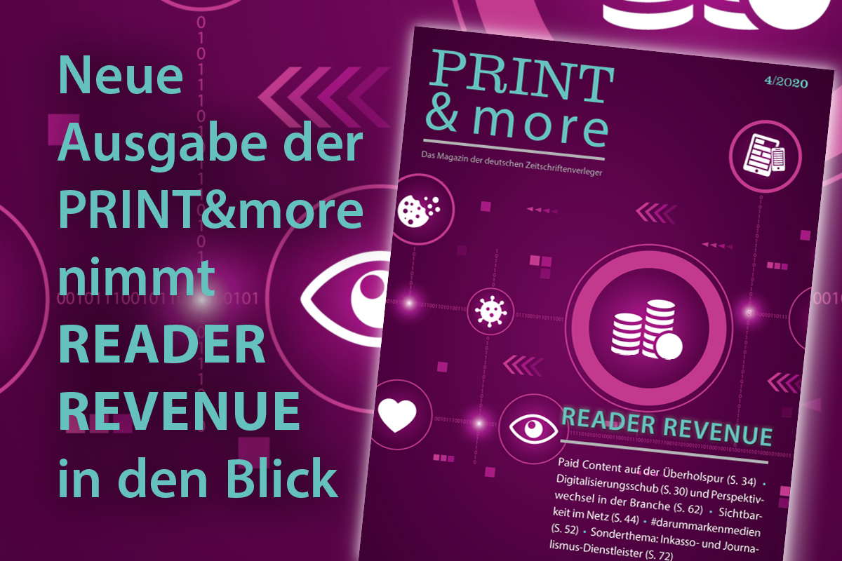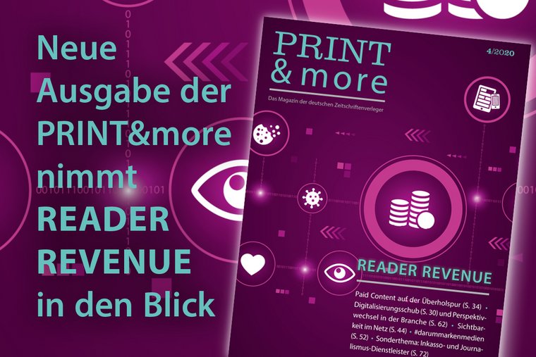 Die Bereitschaft, für journalistische Angebote auch online zu bezahlen, steigt. Ebenso die Bedeutung digitaler Megaplattformen, die quasimonopolistisch darüber entscheiden, ob und wie viel Zugang digitale Pressepublikationen zum Lesermarkt erhalten. Unter dem Titel ‚Reader Revenue‘ thematisiert die neue PRINT&more erstmals auf 86 Seiten den Wert der Sichtbarkeit im Netz sowie Trends und Perspektiven für das Digital- und Printgeschäft der Zeitschriftenverlage.