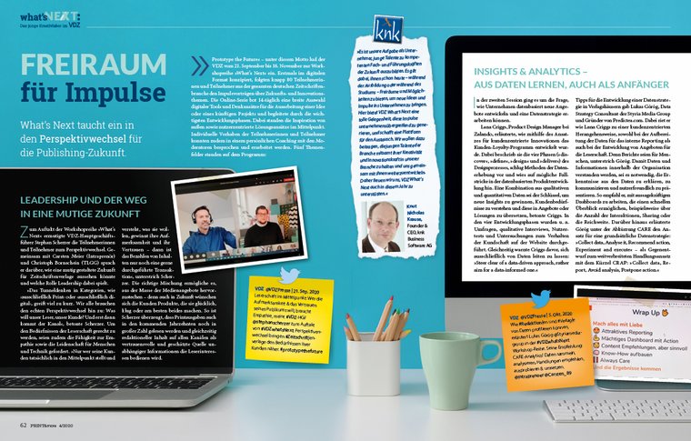 „Digitaler, schneller, mutiger und flexibler“ lautet das Fazit von im VDZ engagierten Verlagsexperten, die in diesem Heft über ihre Erfahrungen und Lehren aus der Corona-Krise berichten. Das bestätigen auch 22 Seiten aktueller Meldungen aus den Verlagen sowie dem VDZ. Neue Perspektiven für die Publishing-Zukunft vermittelte die VDZ-Workshopreihe What’s Next. PRINT&more gibt Einblicke in die fünf digitalen Sessions zu den Themen Leadership, Insights & Analytics, Design Thinking, Rapid Prototyping, Testing, Storytelling und Pitching. Und wie selbst erfahrene Chefredakteure noch immer von Zeitschriftentiteln und dem Mut ihrer Macher überrascht werden können, davon erzählt Modellfahrzeug-Chefredakteur Andreas A. Berse in der Rubrik ‚Am Kiosk‘.