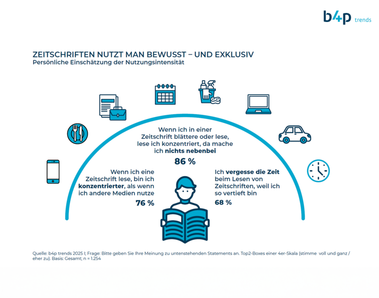 Zeitschriftenlesen ist bewusste Entschleunigung. 88 Prozent nutzen Magazine gezielt als Auszeit, 87 Prozent schätzen die kuratierte Themenvielfalt. Gedruckte Inhalte bieten Struktur und Übersicht – für 84 Prozent ein klarer Vorteil. Zeitschriften sind Stressabbau (85 %) und das Abtauchen in andere Welten (82%), diese Nutzung ist nicht nur entspannend, sondern auch fokussiert: Drei Viertel lesen konzentriert, 68 Prozent tauchen richtig ab. Zeitschriftenlesen ist also ein Ritual – persönlich und wohltuend.
