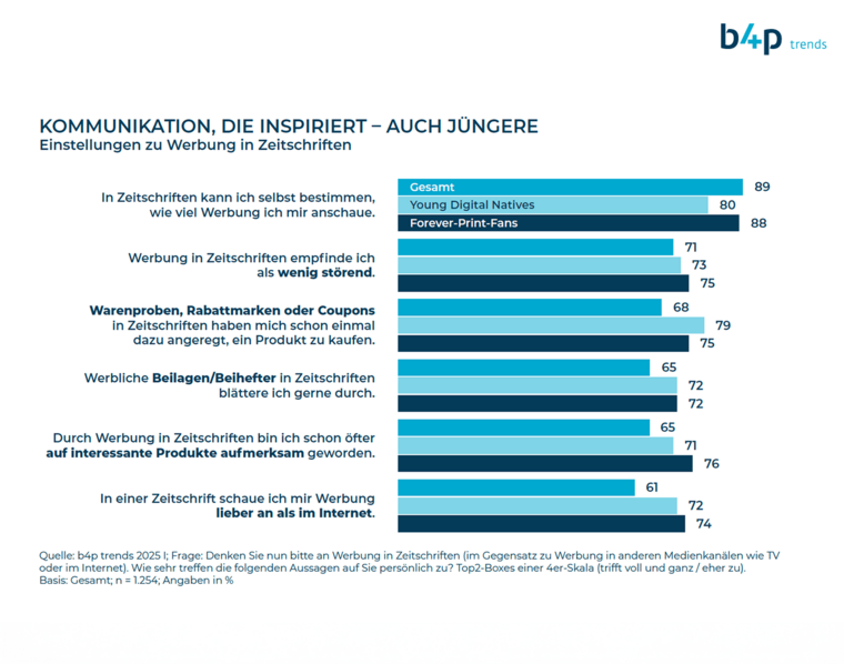 Mit dem neuen b4p Trendreport "Seitenweise Liebe – Mehr als nur gelesen" legt die Gesellschaft für integrierte Kommunikationsforschung (GIK) nicht nur eine Liebeserklärung an das Medium Print vor, sondern liefert überzeugende Belege für dessen emotionale, informative und werbliche Relevanz im modernen Medienmix. Der b4p-Trendreport Publikumszeitschriften 2025 ist repräsentativ für die deutsche Online-Gesamtbevölkerung und bezieht sich auf die Leserschaft, die mindestens (einmal) monatlich Publikumszeitschriften nutzen.