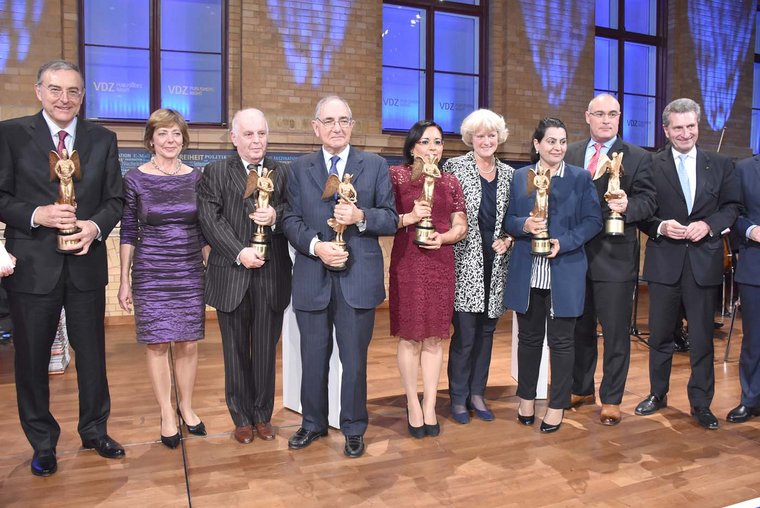 Der Dirigent und Pianist Daniel Barenboim, die Journalisten Peter Bandermann, Ana Lilia Pérez und Farida Nekzad, der portugiesische Außenminister Rui Machete und der BMW-Aufsichtsratschef Dr. Norbert Reithofer sind die Preisträger, die der VDZ im Rahmen der Publishers' Night in Berlin mit der "Goldenen Victoria" ausgezeichnet hat.