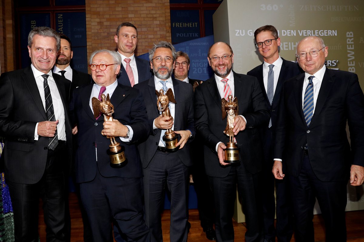 Der Verleger und VDZ-Ehrenpräsident Prof. Dr. Hubert Burda, der Präsident des Europäischen Parlaments Martin Schulz, der Journalist und ehemalige Chefredakteur der Cumhuriyet Can Dündar und das Unternehmen SAP sind die Preisträger, die der VDZ im Rahmen der Publishers' Night in Berlin mit der "Goldenen Victoria" ausgezeichnet hat.