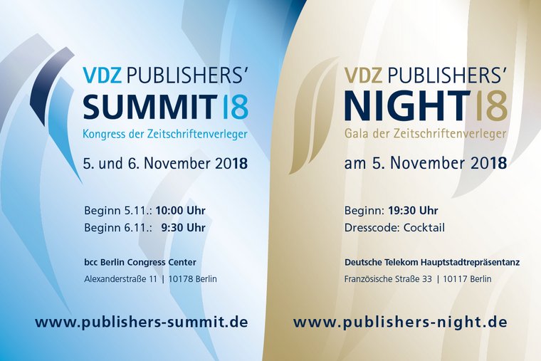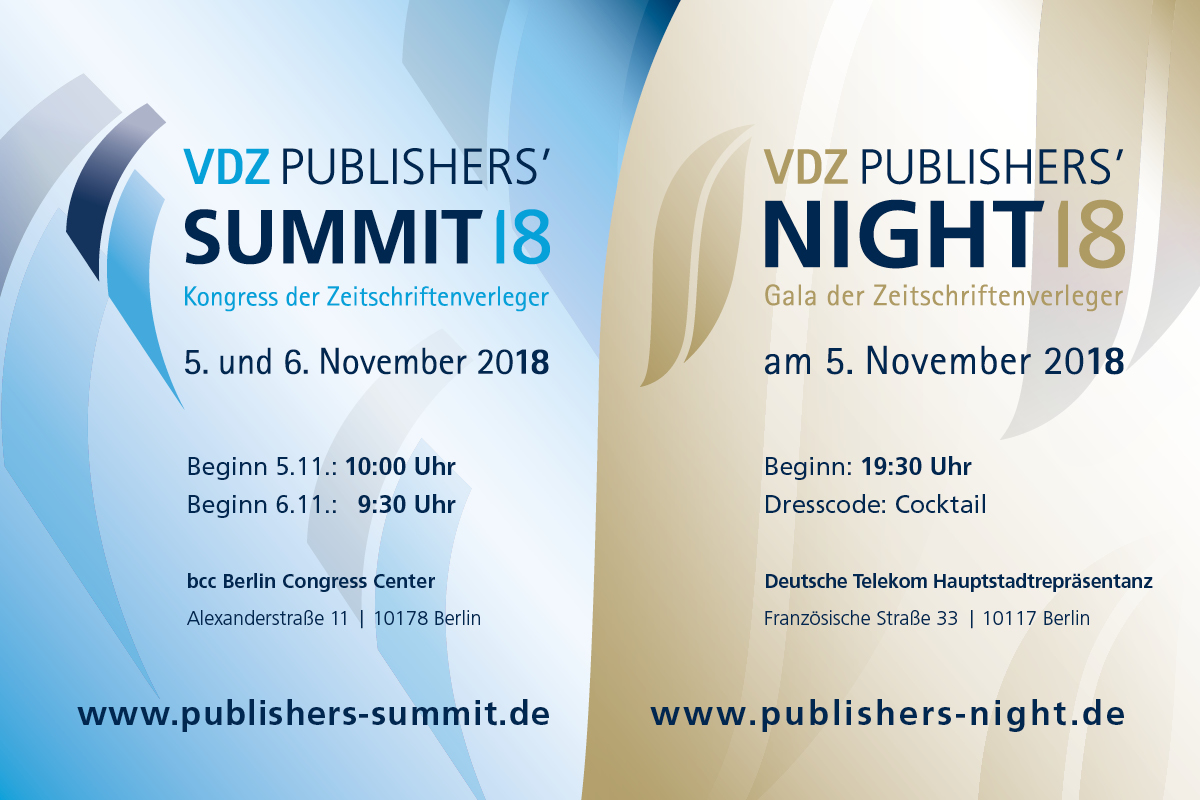 Am 5. und 6. November vernetzt sich in Berlin beim Publishers‘ Summit 2018 die Zeitschriftenbranche mit spannenden Menschen aus Politik, Wirtschaft und Medien. Das Programm fokussiert sich auf die Herausforderungen für Verlage und unsere Gesellschaft. Dazu gehören neben der politischen Keynote fünf Impuls-Vorträge, die Formate „Medien-Talk“ und „Future-Talk“ sowie die „What‘s Next“-Präsentation junger Medienmacher.