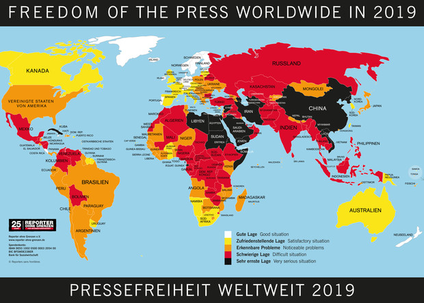 Die Rangliste der Pressefreiheit 2019 vergleicht die Situation für Journalistinnen, Journalisten und Medien in 180 Staaten und Territorien. Untersucht wurde das Kalenderjahr 2018. Grundlagen der Rangliste sind ein Fragebogen zu verschiedenen Aspekten journalistischer Arbeit sowie die von ROG ermittelten Zahlen von Übergriffen, Gewalttaten und Haftstrafen gegen Medienschaffende. Daraus ergeben sich für jedes Land Punktwerte, die im Verhältnis zu den Werten der übrigen Länder die Platzierung in der Rangliste bestimmen. Über die Entwicklung der Situation in einem Land gibt demnach eher ein Vergleich der Punktwerte verschiedener Jahre Auskunft als die Bewegung auf der Rangliste. So kann es vorkommen, dass ein Land in der Rangliste einen großen Sprung gemacht hat, sich die Situation tatsächlich (ablesbar an der Punktzahl) aber nur geringfügig verändert hat. Abhängig vom Abschneiden anderer Länder kann ein Land in der Rangliste im Einzelfall auch aufrücken, obwohl sich seine Punktzahl verschlechtert hat und umgekehrt.