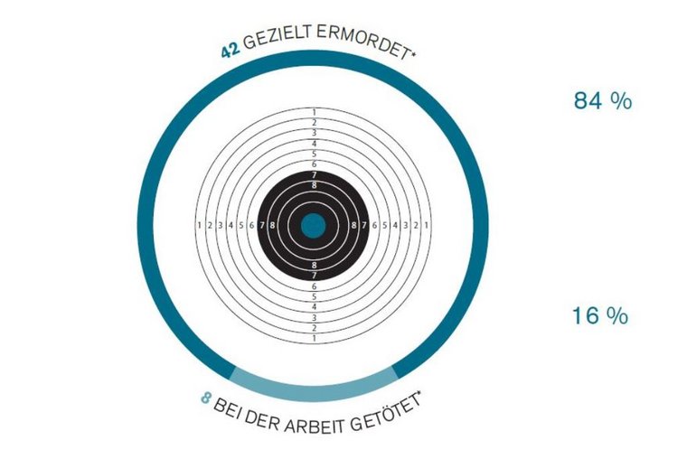 Insgesamt wurden in den vergangenen zehn Jahren weltweit mindestens 937 Menschen wegen oder bei ihrer journalistischen Arbeit getötet. 2019 waren es 53 gewesen.