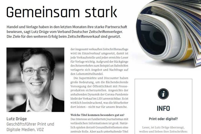 Lutz Drüge: Die Zeitschriftenverlage haben sich in sehr kurzer Zeit auf veränderte Marktbedingungen eingestellt, und der Handel hat die Herausforderung als bedeutender Partner der Verlage beeindruckend gemeistert. Rund die Hälfte der insgesamt verkauften Zeitschriftenauflage wird im Einzelverkauf umgesetzt, damit ist jede Verkaufsstelle und jeder erreichte Leser für Verlage wichtig. Aufgrund der Rückgänge des Reiseverkehrs zum Beispiel an Bahnhöfen verlagerte sich Angebot und Nachfrage auf den Lebensmittelhandel. Die Supermärkte und Discounter haben große Bedeutung, um die flächendeckende Versorgung der Öffentlichkeit mit Presseprodukten sicherzustellen. Angesichts der anhaltenden Dynamik der Corona-Pandemie bleibt der Verkauf im LEH unverzichtbar. Es ist wirklich beeindruckend, was die Mitarbeiter dort leisten – nicht nur für unsere Branche.