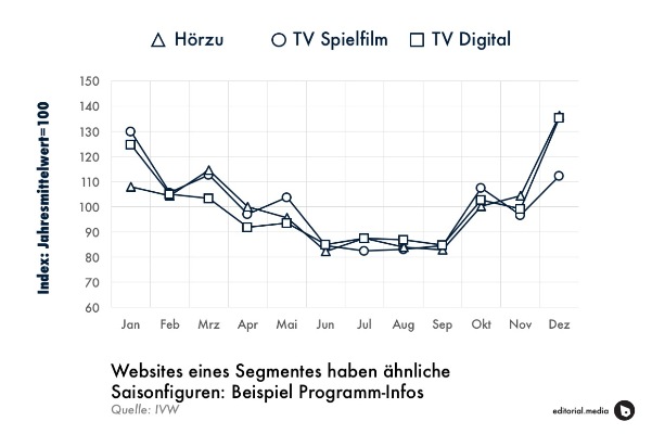 Wenn man nutzwertige Angebote ein- und desselben Genres betrachtet, stößt man auf ähnliche Saisonfiguren. Die Grafik unten illustriert dies für die Sites von TV Spielfilm, Hörzu und TV Digital. Auch hier liegen die Niveaus der Zugriffszahlen weit auseinander: TVSpielfilm.de kommt im Jahresdurchschnitt auf rund 57 Millionen, Hörzu auf sieben Millionen und TV Digital auf eine Million. Die saisonalen Muster der Indexwerte sehen jedoch recht ähnlich aus. Zum "Sommerloch" mit klar unterdurchschnittlichen Visits gehörte 2016 auch der September, der in weiten Teilen Deutschlands ungewöhnlich warm und sonnig ausfiel.