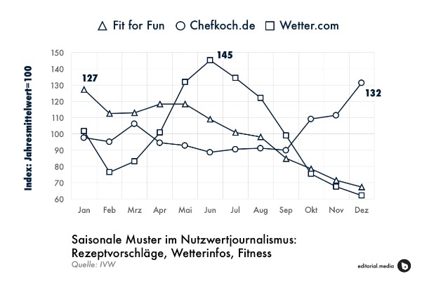 Während die Visit-Zahlen im Nachrichtenjournalismus in starkem Maße ereignisgetrieben sind, weisen sie im Nutzwertjournalismus mehr oder weniger stark ausgeprägte saisonale Muster auf. Dabei hängt die Saisonfigur primär vom Themenfeld ab. Drei Beispiele für Sites mit sehr unterschiedlichen Saisonfiguren sind Chefkoch.de, Wetter.com und Fit for Fun.