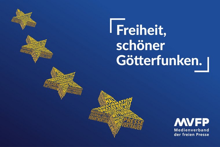 Ein weiteres Motiv interpretiert die Sterne der Europaflagge neu und stellt die Pressefreiheit als europäische Idee in den Mittelpunkt. In Abwandlung der ersten Strophe der Europahymne mit „Freiheit, schöner Götterfunken“ verweist dieses Motiv auf die zunehmende Bedrohung der Pressefreiheit auch in Europa – durch Desinformation, Fake News, Propaganda oder regulatorische Einschränkungen – von innen wie von außen. Gleichzeitig erinnert es an die Ursprünge eines gemeinsamen europäischen Wertefundaments, das nach dem Ende des Zweiten Weltkriegs entstand – mit der Pressefreiheit als tragender Säule – und ruft dazu auf, diese Werte zu verteidigen.