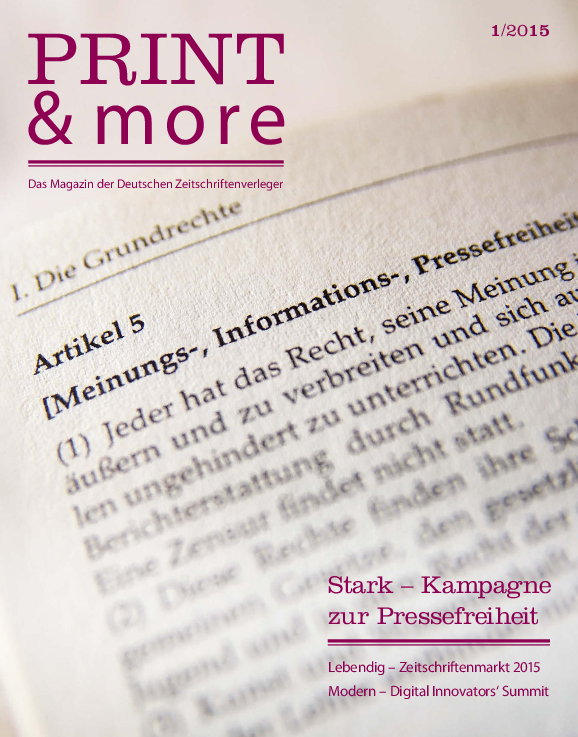 Mit den Anschlägen auf die Pressefreiheit in Paris und in Kopenhagen am Anfang des Jahres kam die Bedrohung der Pressefreiheit aus vermeintlich fernen Krisengebieten mitten im Herzen Europas an. Warum - und warum so wirkungsvoll - haben VDZ und Mitgliedsverlage unter anderem mit einer breit wahrgenommenen Anzeigenkampagne darauf reagiert, und wie geht es weiter – das steht im Mittelpunkt des Artikels unter der Überschrift "Nur gemeinsam stark". Abgerundet wird der Artikel durch ein Portrait des gemeinnützigen Recherchebüros "CORRECT!V" sowie die neue Weltkarte der Pressefreiheit von Reportern ohne Grenzen.