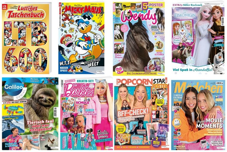 Besonders die Magazinklassiker des Verlags glänzen mit Spitzenwerten. Bei den sechs- bis 13-jährigen Mädchen und Jungen erzielen Titel wie das Walt Disney Lustiges Taschenbuch (LTB) (501.000 Leser pro Ausgabe (LpA)), das LTB Spezial (382.000 LpA), Barbie (330.000 LpA), Mädchen (315.000 LpA), Wendy (314.000 LpA), das Micky Maus Magazin (312.000 LpA) und Galileo genial (306.000 LpA) starke Reichweiten. Bei den 10- bis 13-jährigen Mädchen belegen die Magazine Mädchen (261.000 LpA) und Popcorn (228.000 LpA) sogar die ersten beiden Plätze im Ranking aller untersuchten Titel. Beeindruckend sind auch die Leistungswerte der mitlesenden Eltern. Rund 2,3 Millionen Eltern, das entspricht etwa 80 Prozent, lesen bei mindestens einer der genannten Egmont Ehapa Media-Zeitschriften mit.