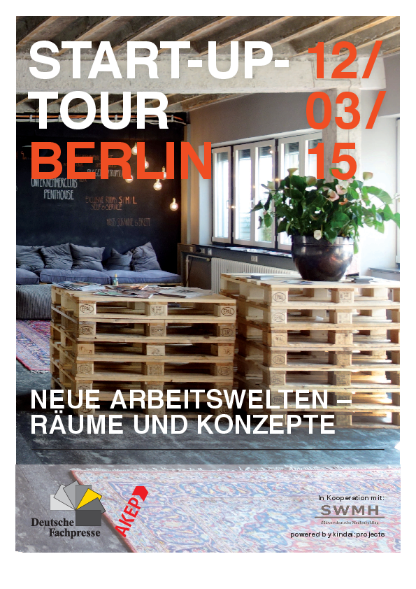 Lassen Sie sich inspirieren! Der schnelle Wandel in der Medienbranche erfordert die Auseinandersetzung mit neuen Arbeitswelten und Konzepten der Zusammenarbeit. Diese neuen Arbeitswelten erkundet die Start-up-Tour der Deutschen Fachpresse und des AKEP am 12. März in Berlin. Wie sieht unser Arbeitsplatz von morgen aus? Wie und mit wem arbeiten wir zusammen? Welche Anforderungen haben junge Kreative heute an ihren Arbeitsplatz und mit welchen Methoden erarbeiten Start-ups neue Ideen? Die Start-up-Tour richtet sich exklusiv an maximal 20 Teilnehmer, die Plätze werden nach Eingang der Anmeldung vergeben.