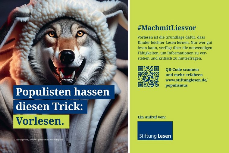 „Populisten hassen diesen Trick: Vorlesen.“ – mit frechen Sprüchen und bildstarken, KI-generierten Motiven ist die Vorlese-Kampagne der Stiftung Lesen ein echter Hingucker. Neben dem Wolf im Schafspelz werben vom Aussterben bedrohte Eisbären, erfolgreiche Dachse oder schlaue Eulen für das Vorlesen. Denn egal ob im Kampf gegen Populismus, den Klimawandel oder für gleiche Startchancen für alle Kinder in Deutschland: Vorlesen schafft die Grundlage für Wissen, Bildung und wirtschaftlichen Erfolg. #MachmitLiesvor – die Kampagne der Stiftung Lesen startet am 23. September. Jede Woche wird eines der fünf Motive auf den Social-Media-Kanälen der Stiftung veröffentlicht: Begleitet von zahlreichen Informations- und Weiterbildungsangeboten für alle, die sich ein freiwilliges Engagement vorstellen können. Sabine Uehlein, Geschäftsführerin Programme Stiftung Lesen, unterstreicht: „Lesen ist kein Hobby, sondern eine zentrale Grundlage für eine gesunde, belastbare Gesellschaft. Freiwilliges Engagement macht daher für die Zukunft von Kindern, aber auch die Gesellschaft einen echten Unterschied. Diesen Zusammenhang stellen wir heraus und bringen freiwilliges Engagement für das Lesen in das Bewusstsein der Menschen.“