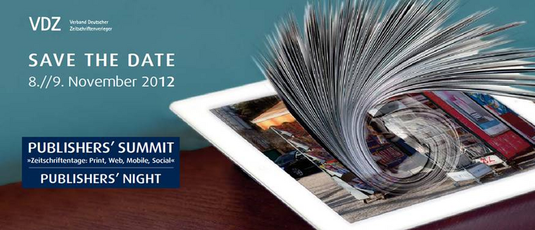 Daher lädt der VDZ erstmals unter dem neuen Titel Publishers ’ Summit 2012, aber in bester Tradition der etablierten >>Zeitschriftentage<<, führende nationale und internationale Verleger, Geschäftsführer und Topmanager der Zeitschriftenbranche am 8. und 9. November nach Berlin.