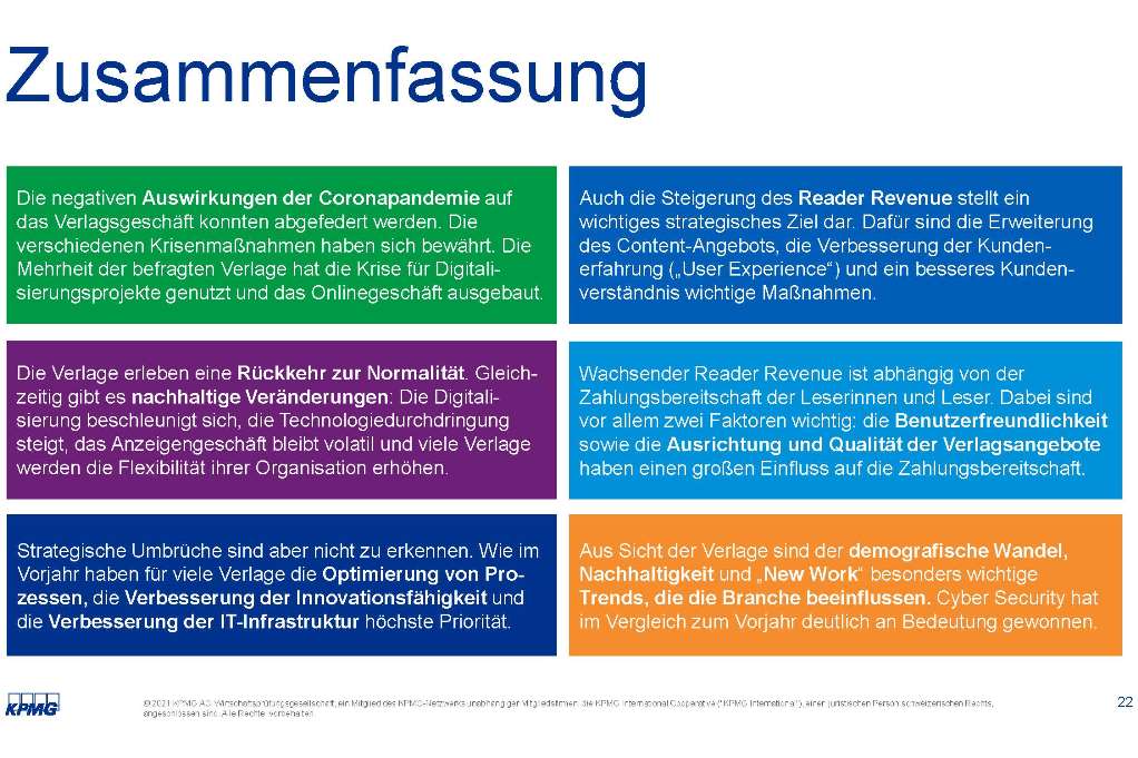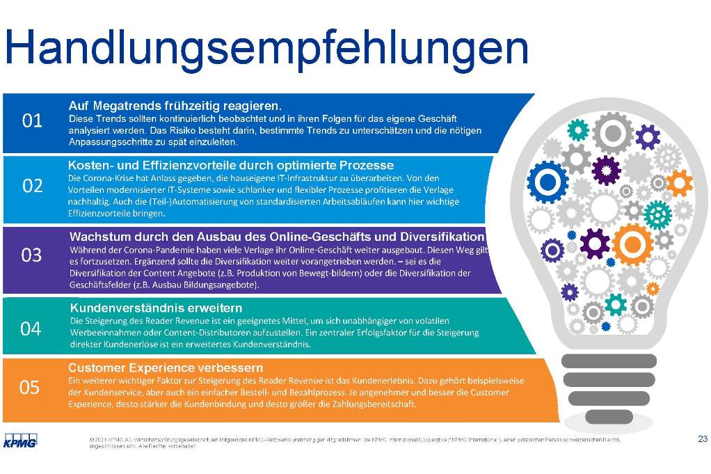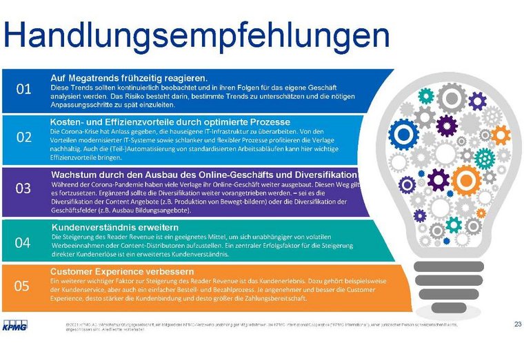 „Verlage sollten ihr Portfolio weiter diversifizieren und ihr Geschäft stärker auf direkte Kundenerlöse ausrichten, um Wachstumspotenziale zu erschließen und sich unabhängiger von volatilen Werbeeinnahmen aufzustellen. Unsere Studienergebnisse liefern Anhaltspunkte, welche Maßnahmen und Aktivitäten zur Steigerung des Reader Revenue häufig ergriffen werden und erfolgsversprechend sind“, fasste Dr. Markus Kreher, Head of Technology, Media & Telecommunications (TMT) der KPMG AG, die Ergebnisse zusammen. Und führte weiter aus: „Das sollte für jene Verlage eine Orientierung sein, die ihre Umsatzstruktur zukünftig stärker auf direkte Kundenerlöse umbauen wollen.“