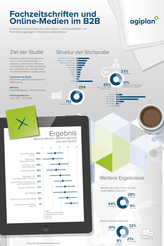 Trotz Digitalisierung und neuer Medien bleiben gedruckte Fachzeitschriften und allgemeine Wirtschaftsmedien die wichtigsten Informationsmittel für deutsche Entscheidungsträger. Das ist eines der zentralen Ergebnisse einer Studie, die das Beratungs- und Planungsunternehmen agiplan in Auftrag gegeben hat. "Erst an dritter Stellen der bevorzugten Medien stehen Hersteller- und Fachwebseiten", sagt Studienleiterin Marie-Christin Ackermann.