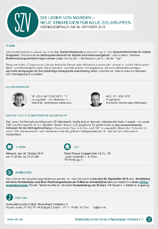 Sie wollen wissen, wie Sie Ihre Leser auch in Zukunft noch erreichen? Dann verpassen Sie nicht das SZV-Abendgespräch "Die Leser von morgen - Neue Strategien für neue Zielgruppen" am 8. Oktober 2015 in Stuttgart. Hier geht es zur Einladung und hier zur Anmeldung.