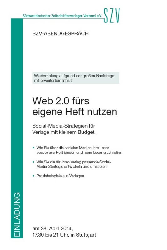 SZV-Abendgespräch: Web 2.0 fürs eigene Heft nutzen - Social-Media-Strategien für Verlage mit kleinem Budget