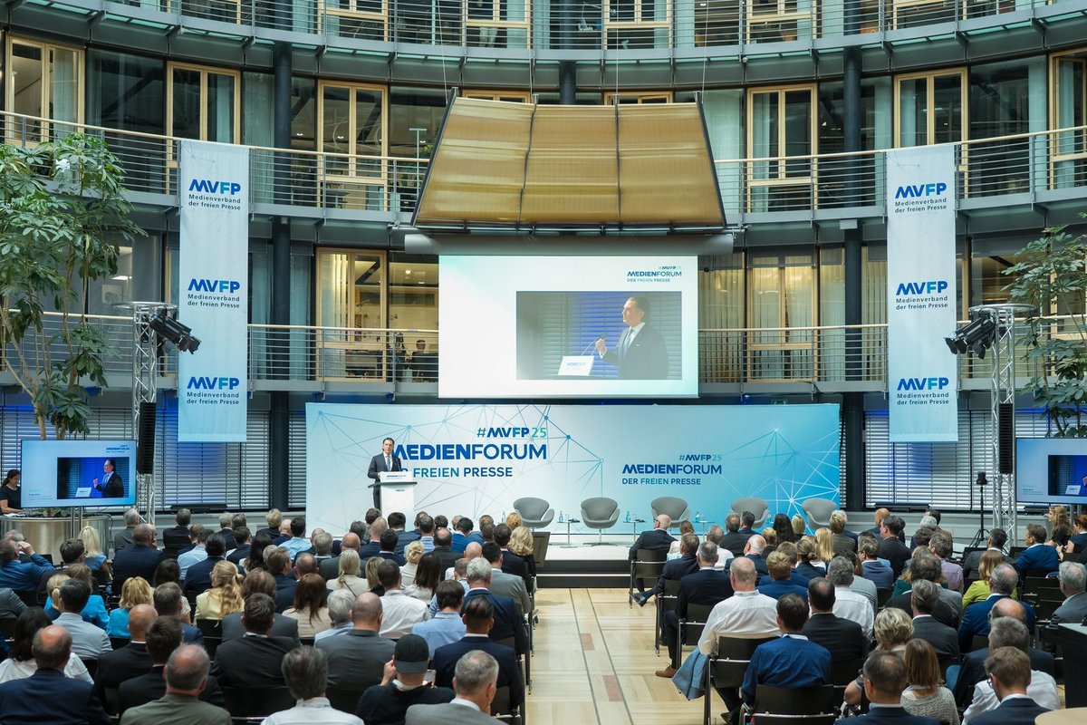 Im Fokus seiner Rede stand der Anspruch der Verlage, gerade in Zeiten wachsender Desinformation und politischer Polarisierung als verlässliche Stimme der Demokratie zu wirken. „Wir Verlage verstehen uns als Bastion der verlässlichen Information in der Flut der Unwahrheiten. Mit verantwortlichem Journalismus werden wir dieser Aufgabe gerecht“, betonte Welte – und verwies auf das kurz zuvor von der MVFP-Delegiertenversammlung verabschiedete Grundsatzpapier „Verantwortung. Verlässlichkeit. Vielfalt. Was die professionellen Medien der freien Presse von AI-Inhalten, sozialen Medien und digitalen Plattformen unterscheidet“. Darin betonen die Verlage ihre besondere Verantwortung für eine von politischer und wirtschaftlicher Einflussnahme unabhängige Berichterstattung, ihr Selbstverständnis als verlässliche Quelle in einer Ära der digitalen Desinformation und ihren Anspruch, die Vielfalt einer pluralistischen Gesellschaft journalistisch abzubilden.