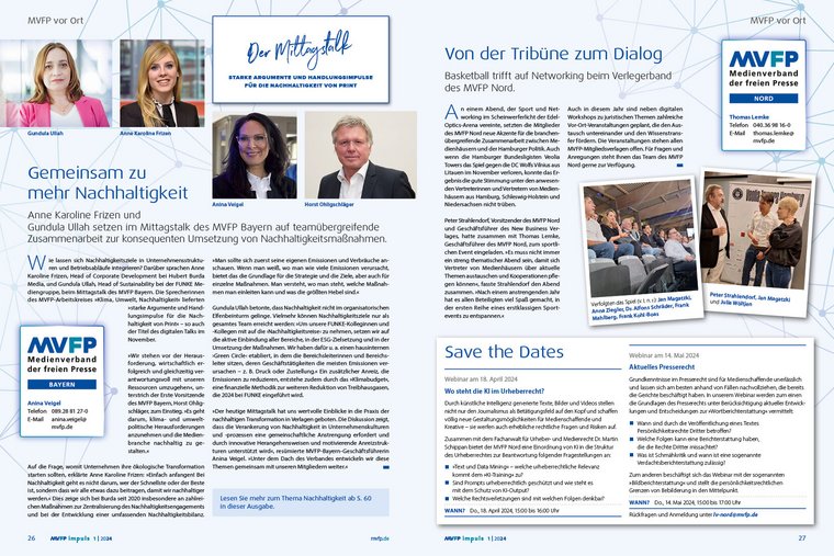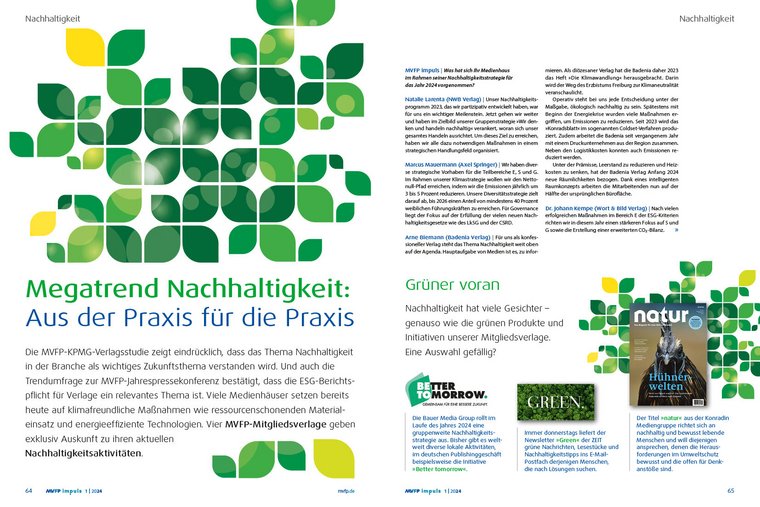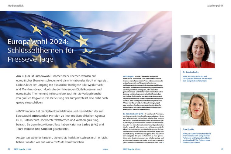 Die bevorstehende Europawahl rückt Themen in den Fokus, die für die Freiheit und Vielfalt der Presse von zentraler Bedeutung sind. MVFP impuls hat die Spitzenkandidatinnen und Spitzenkandidaten der zur Europawahl antretenden Parteien zu KI, Datenschutz, Torwächterplattformen und Werberegulierung befragt. Dr. Katarina Barley (SPD) und Terry Reintke (Die Grünen) antworten in dieser Ausgabe (S. 48). Welche neuen Möglichkeiten die Einführung von generativer KI in Redaktionen eröffnet, aber auch, welche Fragen zu Authentizität, Urheberschaft und der Zukunft journalistischer Arbeit sie aufwirft, erläutert Morgenpost-Chefredakteur Peter Schink in seinem Gastbeitrag (S. 56). Die Schlüsselrolle von künstlicher Intelligenz und die strategischen Schwerpunkte der Presseverlage verdeutlicht eine aktuelle Studie von MVFP und KPMG. Die Verlagsstudie zeigt zudem, wie Verlage über die gesetzlichen Verpflichtungen hinaus auf das Thema Nachhaltigkeit setzen (S. 60), in MVFP impuls ergänzt durch Einblicke in die vielfältigen Nachhaltigkeitsaktivitäten der MVFP-Mitgliedsverlage, die dieses Engagement unterstreichen (S. 64).