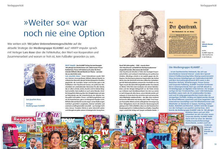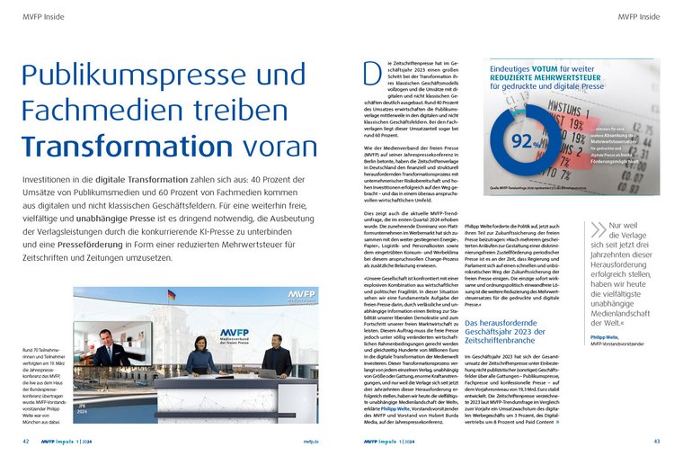 Die digitale Transformation, befeuert von den Netzwerkeffekten der Plattformökonomie und den rasanten Entwicklungen rund um generative KI, betrifft alle publizistischen Felder der Verlage. Die neue Ausgabe von MVFP impuls gibt Einblicke in neue und inspirierende Strategien und Beispiele der Transformation von Presseverlagen, die durch die unaufhaltsame Dynamik der Digitalisierung vorangetrieben wird. Dies belegen auch die aktuellen Branchendaten, die auf der Jahrespressekonferenz des MVFP vorgestellt wurden (S. 42). Die Ergebnisse der MVFP-Trendumfrage zeigen, dass die Investitionen in die Transformation unerlässlich sind, um die Vielfalt und Unabhängigkeit der Medienlandschaft zu erhalten. „Nur weil die Verlage sich seit jetzt drei Jahrzehnten dieser Herausforderung erfolgreich stellen, haben wir heute die vielfältigste unabhängige Medienlandschaft der Welt“, erklärt dazu Philipp Welte (S. 43). Wie Presseverlage die Herausforderung meistern, jüngere Zielgruppen über verschiedene Kanäle zu erreichen (S. 46), und inwieweit KI-Technologien bereits Verlagsprozesse durchdringen (S. 38, 56), sind weitere Themen dieser Ausgabe. Verleger Lars Joachim Rose blickt im exklusiven Interview auf die 180-jährige Transformationsgeschichte der Mediengruppe KLAMBT, vom Zeitschriftenverlag zum Medienhaus mit vielen Standbeinen (S. 52) und reflektiert den Wert der Pressefreiheit für unsere Gesellschaft. Der Journalist Paul Caruana Galizia, Sohn der 2017 ermordeten Journalistin Daphne Caruana Galizia, spricht im Interview über sein Buch „A Death in Malta“, wie ihn der Einfluss seiner Mutter geprägt hat und was Pressefreiheit für ihn bedeutet (S. 32).