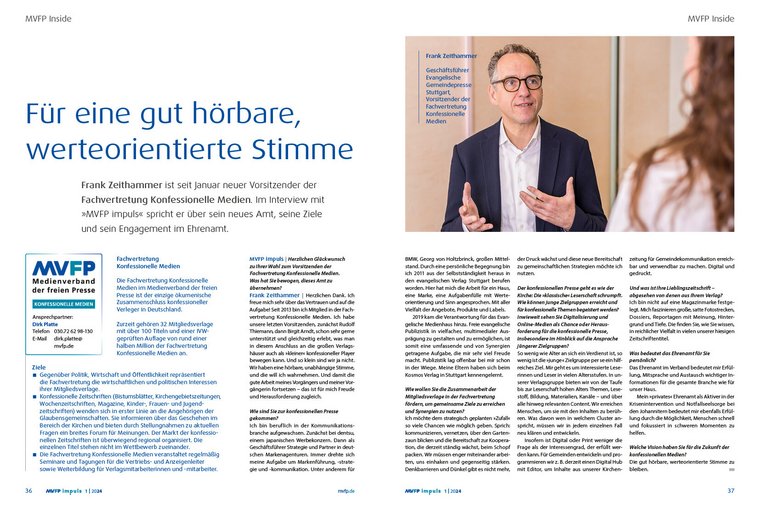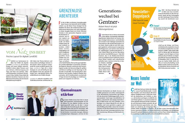 Auf über 30 Seiten bietet diese 80-seitige MVFP impuls aktuelle Informationen aus dem MVFP und seinen Mitgliedsverlagen, einen Überblick über die vielfältigen zum Networking- und Austauschmöglichkeiten in den Landes- und Fachvertretungen sowie den Wissenstransfer durch die Präsenzveranstaltungen und Webinare der MVFP Akademie. Außerdem gibt sie einen Ausblick auf kommende Veranstaltungen wie die Mediennacht und den Medienkongress der freien Presse am 6. und 7. Juni 2024 in Berlin. „Esquire“-Chefredakteur Dominik Schütte verrät, warum er „Am Kiosk“ am liebsten zum „Rolling Stone“ greift.