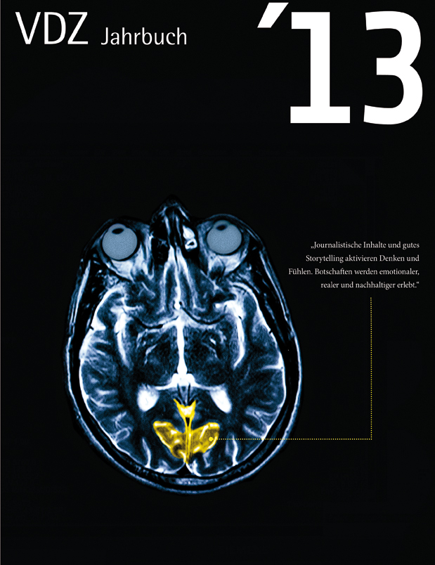 - Auch das aktuelle Cover verfolgt einen neuen Ansatz: Es löst die personalisierten Titelbilder nun durch eine Orientierung an einer überraschenden Sachaussage ab. So zeigt das Cover des neuen Jahrbuches das Bild eines menschlichen Gehirns, betrachtet durch einen Magnetresonanz-Tomographen (MRT). Die Botschaft: Wir können gar nicht anders, als gute Inhalte mit Begeisterung wahrzunehmen. (Das Cover können Sie zur freien Verwendung in einer hohen Auflösung <link fileadmin vdz_de user_upload download presse downloads _blank>hier herunterladen)