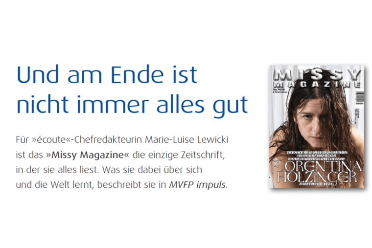 „Missy“ hat Mut. Wie sehr man den braucht, wenn man ein feministisches Magazin auch wirtschaftlich über die Runden bringen will, verrät die Geschäftsleitung, Ulla Heinrich, selbst im aktuellen Heft – und spricht über den täglichen Spagat zwischen begrenzten Mitteln, Qualitätsanspruch und Selbstausbeutung und darüber, dass man auch bei „Missy“ manchmal einfach müde ist.