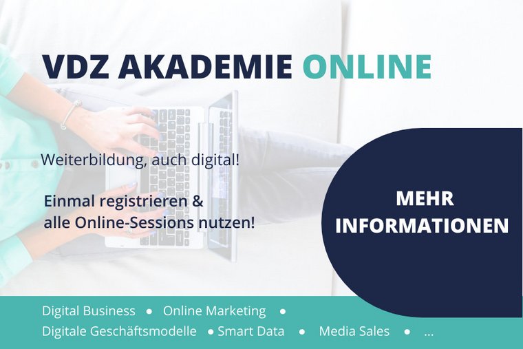 Mit „VDZ Akademie ONLINE“ bietet der VDZ mehr als 20 kurze, digitale Wissenshappen zu aktuellen Themen aus dem Medienbusiness. Auf der Agenda stehen live und On-Demand Sessions aus den Bereichen Digital Business, Online Marketing, Pressevertrieb, Smart Data und Media Sales. Das Programm wächst stetig.