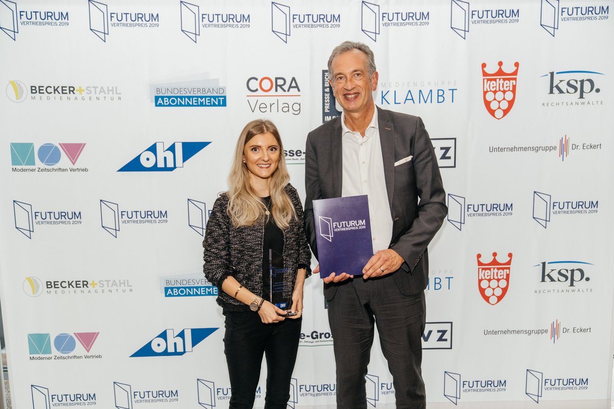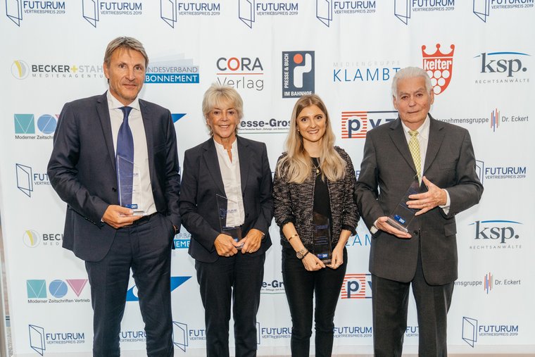 Gestern Abend wurden vier Preisträger mit den in diesem Jahr zum zehnten Mal verliehenen FUTURUM Vertriebspreisen ausgezeichnet, die vom VDZ und der Fachzeitschrift DNV in drei Kategorien gemeinsam vergeben werden. Der FUTURUM Ehrenpreis wurde gleich zwei Vertriebspersönlichkeiten zuteil, die sich mit ihrem großartigen Engagement und breitem Wissen um die Weiterentwicklung des Vertriebs von Zeitschriften verdient gemacht haben. Die Preisträger sind die stellvertretende Vorsitzende des Verbands Deutscher Lesezirkel Beate Becker-Stahl und der Finanzvorstand des Bundesverbands Abonnement Wilfried Paepcke. „Beide haben mit großer Beharrlichkeit und profunder Detailkenntnis die Modernität und Effizienz ihrer jeweiligen Vertriebssparte immer im Fokus. Dafür gebührt ihnen große Anerkennung und unser herzlicher Dank“, erklärte Drüge.