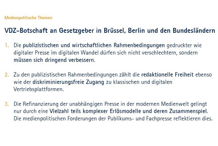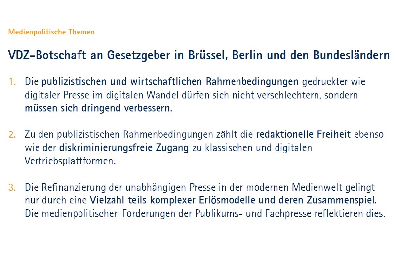 - Der VDZ fordert darüber hinaus die Bundesregierung auf, sich in Brüssel weiterhin energisch gegen weitere Werbebeschränkungen und für den reduzierten Mehrwertsteuersatz für die digitale Presse einzusetzen.