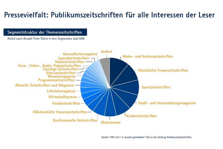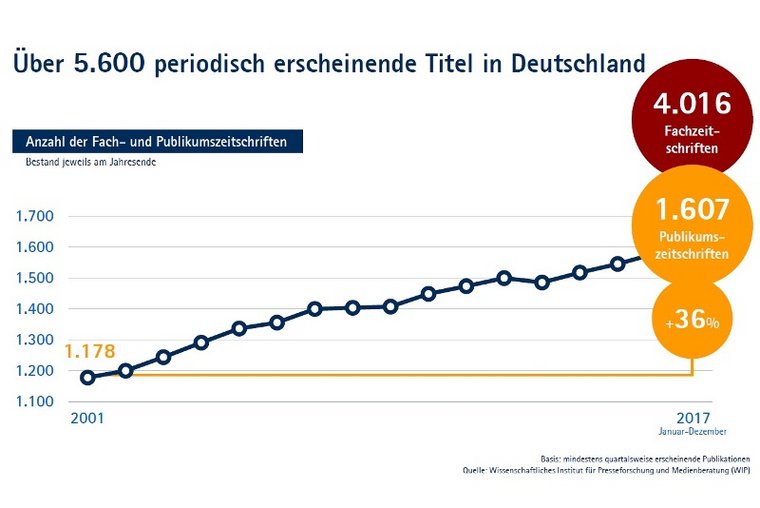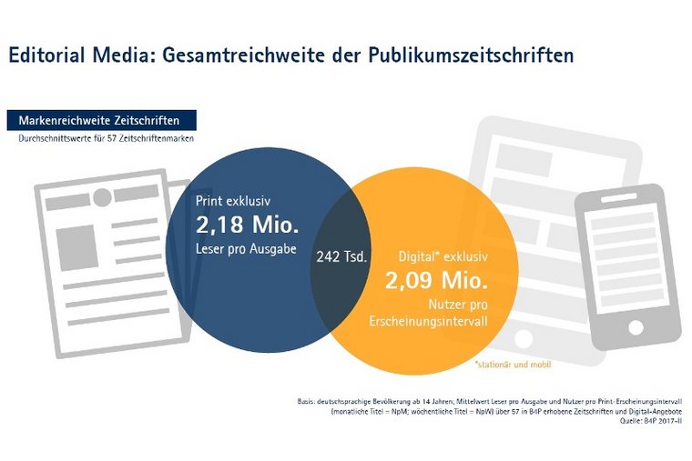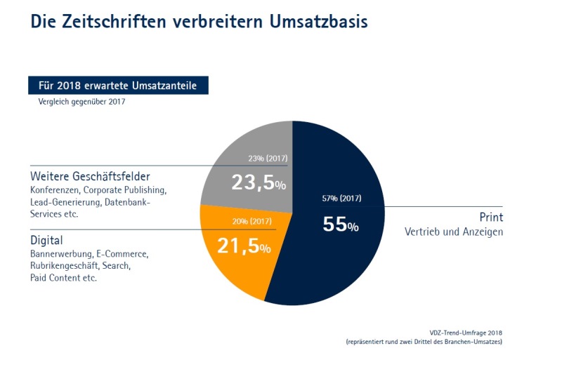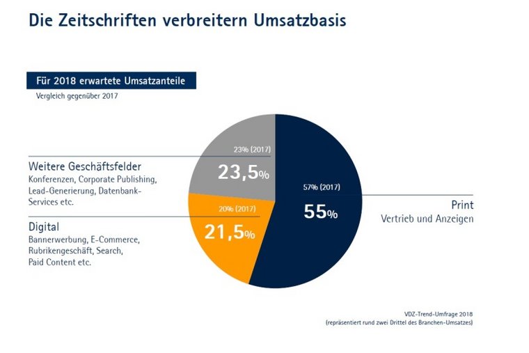 Dank Diversifikation, wachsendem Digital- und Veranstaltungsgeschäft und ersten Kooperationen konnten die Zeitschriftenverlage die Rückgänge im Anzeigen- und Vertriebsgeschäft auffangen und das Geschäftsjahr 2017 auf Vorjahreshöhe mit 14,8 Mrd. Euro bei rund 60.000 Mitarbeiter abschließen.