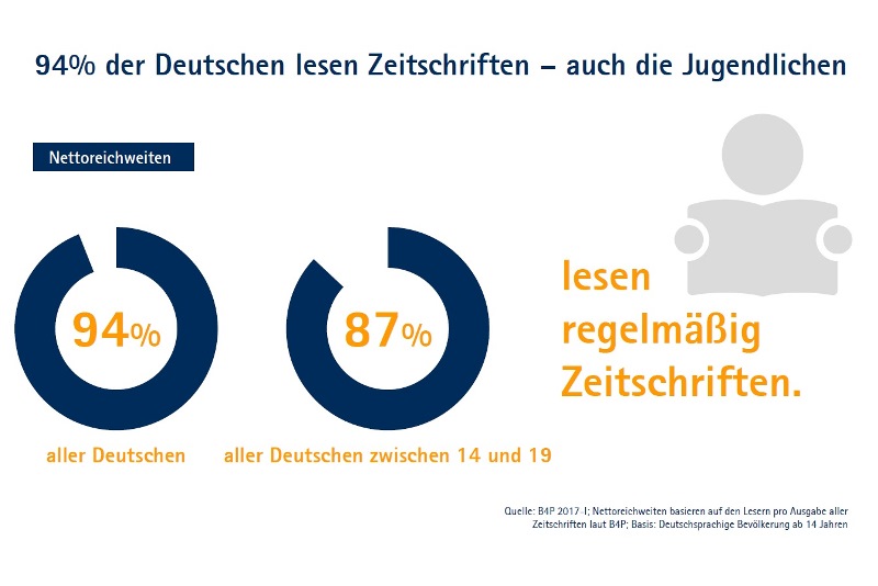 Deutschland hat eine ausgesprochen vitale und vielfältige Zeitschriftenlandschaft. Die Reichweite von Zeitschriften in der Bevölkerung ist weiter sehr hoch: 94 Prozent der deutschsprachigen Bevölkerung und 87 Prozent der Altersgruppe zwischen 14 und 19 Jahren lesen Zeitschriften. Mit 1,7 Mrd. verkauften Publikumszeitschriften kauft theoretisch jeder Einwohner in Deutschland 20 Magazine im Jahr. Dies führt zu 2,7 Mrd. Euro Vertriebserlösen. „Das ist Paid Content in bester Form. Diese Bereitschaft, für journalistische Inhalte zu zahlen, zeichnet unseren Pressemarkt aus“, so Scherzer. Die Verlage bilden mit ihren Produkten Print und Online die Lebenswelten der Deutschen mit ihren speziellen Interessen erfolgreich ab.