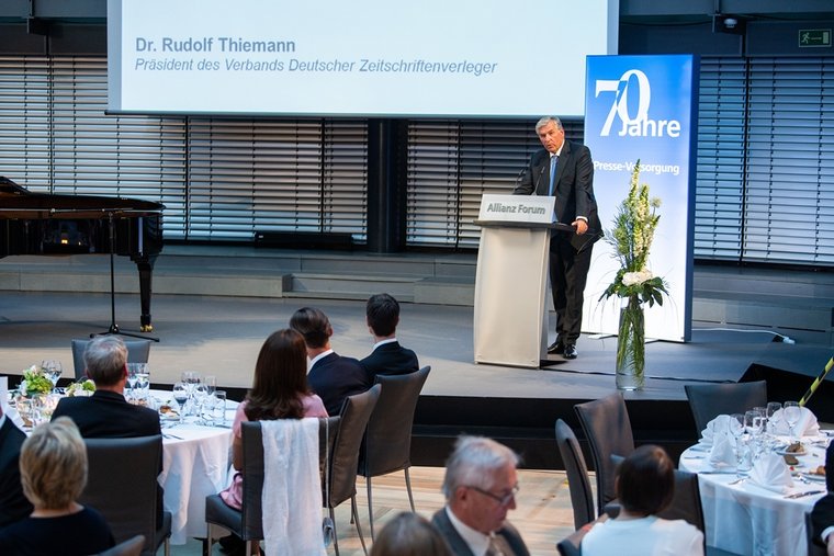 „Bekenntnisse zur Pressefreiheit sind wichtig, genügen aber nicht“, sagte Dr. Thiemann auf der Festveranstaltung zu 70 Jahre Versorgungswerk der Presse am Dienstag im Allianz Forum in Berlin. „Politiker in Berlin und Brüssel müssen darauf achten, dass sie die Bedingungen für den Erhalt der Presse auf allen klassischen und digitalen Verbreitungswegen nicht verschlechtern, sondern verbessern“, so Dr. Thiemann weiter.