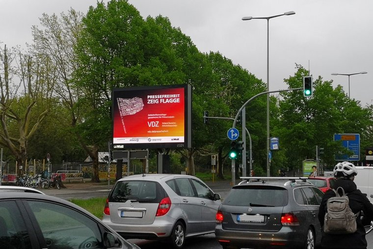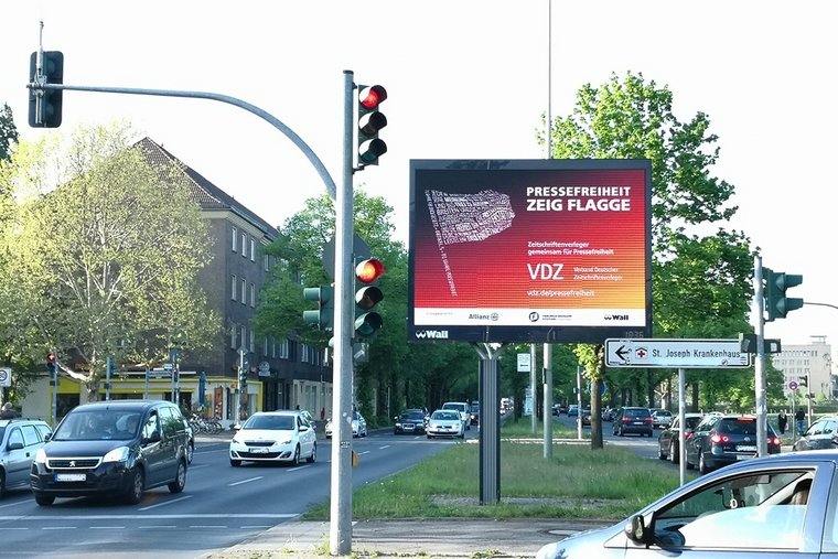 Dank der freundlichen Unterstützung durch die Wall GmbH heißt es seit Montag an fast 50 Stellen in Berlin: Pressefreiheit Zeig Flagge! Das neue Anzeigenmotiv des VDZ, inspiriert von 70 Jahre Grundgesetz, richtet sich an alle, die sich Pressefreiheit auf die Fahne schreiben.