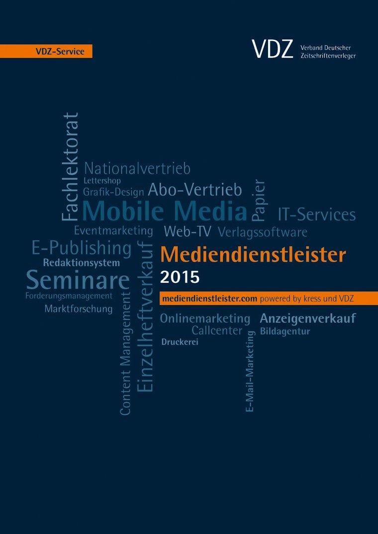 Der VDZ hat das neue Mediendienstleisterverzeichnis 2015 vorgestellt. Das Nachschlagewerk enthält über 300 Einträge spezialisierter Dienstleister für die Medienbranche unter mehr als 100 spezifischen Schlagworten. Entscheider finden im Mediendienstleisterverzeichnis schnell umfassende Informationen zu Dienstleistern verschiedenster Bereiche – von Content-Marketing bis IT-Services und von Cross Media Publishing bis Web-TV.