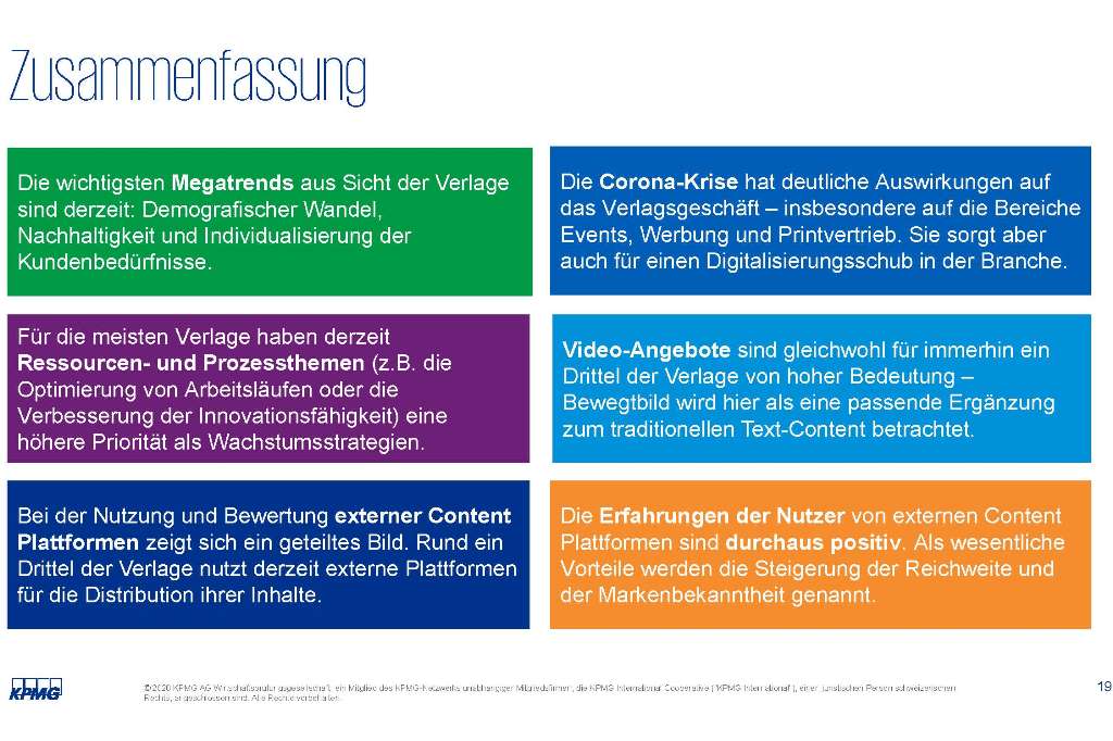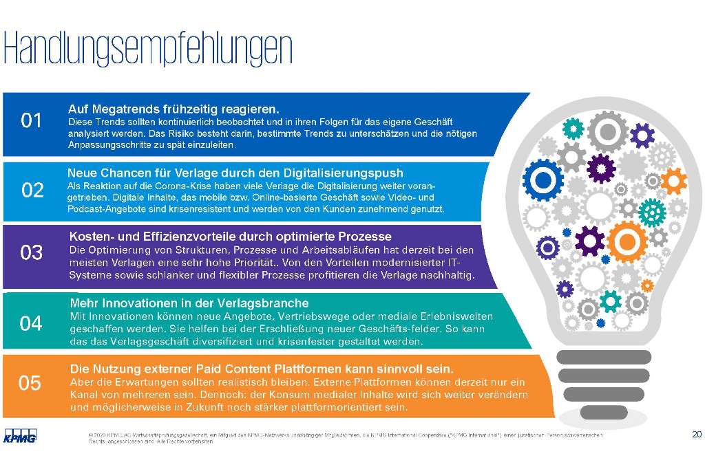 Neben den Auswirkungen der Corona-Pandemie auf das Verlagsgeschäft präsentierten die Referenten Dr. Markus Kreher, Head of Media der KPMG AG Wirtschaftsprüfungsgesellschaft, und Prof. Dr. Thomas Hess vom Institut für Wirtschaftsinformatik und Neue Medien der Ludwig-Maximilians-Universität München, die Bedeutung ausgewählter Trends für die Branche sowie strategische Schwerpunkte der Verlagshäuser und deren Chancen – beispielsweise durch externe Paid-Content-Plattformen.
