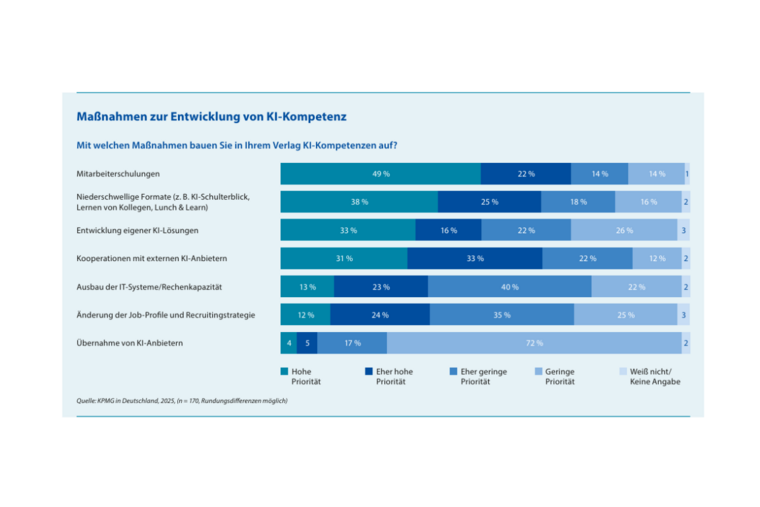 Künstliche Intelligenz steht im Zentrum der diesjährigen Studie. Die Ergebnisse bekräftigen, dass das Thema in den Verlagen angekommen ist und stetig in neue Bereiche vordringt. 61 Prozent der befragten Verlage beschäftigen sich aktiv mit der Entwicklung und Umsetzung einer KI-Strategie: 36 Prozent haben eine solche Strategie bereits ausgearbeitet, weitere 25 Prozent befinden sich in der Planung oder Umsetzung. Dabei erweisen sich Mitarbeiterschulungen als wichtigster Hebel für den Einsatz von KI: 71 Prozent der befragten Verlage räumen dem Thema eine hohe Priorität ein, 63 Prozent setzen auf niedrigschwellige Lernformate. Darüber hinaus gewinnen Kooperationen mit externen KI-Anbietern (64 Prozent) und die Entwicklung eigener Lösungen (49 Prozent) an Bedeutung.