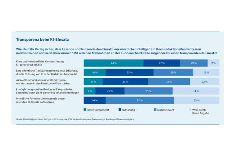 Die klare Kennzeichnung von KI-generierten Inhalten ist aktuell die wichtigste Maßnahme zur Herstellung von Transparenz. Bereits 44 Prozent der Verlage setzen sie um, bei 27 Prozent ist sie in Planung. Weitere Maßnahmen wie eigene Transparenzseiten (16 Prozent umgesetzt; 35 Prozent in Planung) und die aktive Kommunikation von KI-Prinzipien (14 Prozent umgesetzt; 33 Prozent in Planung) sind mehrheitlich noch in Vorbereitung.