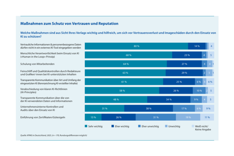 „Der vertrauensvolle Einsatz von KI in der Verlagsbranche erfordert eine klare, transparente Kommunikation und ethische Verantwortung, um sowohl die Kreativität zu fördern als auch die Integrität zu wahren und die Glaubwürdigkeit professioneller Medien zu schützen“, betont Katja Modder, Head of TMT, KPMG. „Verlage sollten sicherstellen, dass alle Beschäftigten über die Funktionsweise und die Entscheidungsprozesse der eingesetzten KI informiert sind. Gleichzeitig braucht es klare ethische Richtlinien, die weiterhin Vielfalt und Kreativität erlauben aber auch einen unkontrollierten KI-Einsatz begrenzen und Missbrauch verhindern. Letztlich ermöglicht es nur ein ‚Trusted AI‘-Ansatz, die Vorteile der KI auszuschöpfen und gleichzeitig die Integrität der Verlage zu wahren.“