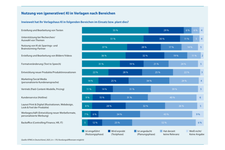 KI kommt vor allem bei der Unterstützung kreativer Prozesse und redaktioneller Arbeit zum Einsatz: 55 Prozent der Verlage nutzen KI für Texterstellung und -bearbeitung, 51 Prozent für Rechercheunterstützung und 36 Prozent für Bild- und Videoerstellung und -bearbeitung. Der Nutzungsgrad spezifischer Anwendungen wie Text-to-Speech (31 Prozent) und der Einsatz von KI als Sparringspartner (37 Prozent) erleben außerdem einen kontinuierlichen Anstieg. In administrativen Bereichen, im Kundenservice und Vertrieb ist der KI-Einsatz bislang noch gering.