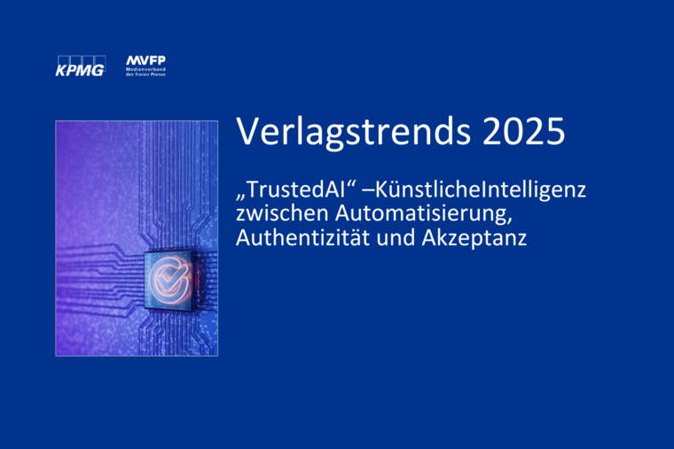 Die technologische Transformation, Unsicherheiten durch geopolitische Konflikte und Cyberangriffe sowie der demografische Wandel bestimmen 2025 die Entwicklungen der Verlagsbranche. Dies verdeutlicht die neue Studie „Verlagstrends 2025: Trusted AI – KI zwischen Automatisierung, Authentizität und Akzeptanz“ des Medienverbands der freien Presse (MVFP), die in Zusammenarbeit mit KPMG und Prof. Dr. Thomas Hess von der LMU München erstellt wurde. Demnach sind Automatisierung, Prozessoptimierung und der verantwortungsvolle Einsatz künstlicher Intelligenz die zentralen Bausteine der Verlagsstrategien.