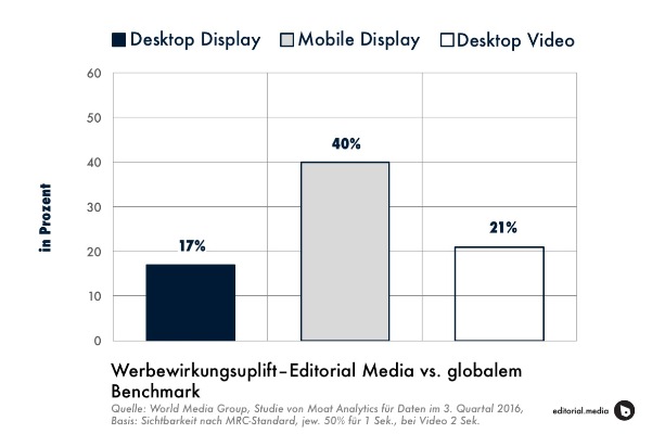 Das Ergebnis: Die redaktionellen Umfelder der Editorial Media-Angebote von WMG haben signifikant bessere Werte für alle untersuchten Werbemittel und für alle Sichtbarkeitskriterien. Der Werbewirkungs-Uplift gegenüber dem globalen Benchmark beträgt dabei bis zu 40 Prozent. Dabei liegen diesen Daten die besonders strengen Viewability-Kriterien des Media Rating Media Rating Councils, MRC, zugrunde.