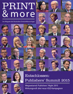 Die vierte VDZ PRINT&more des Jahres ist da! Mit 76 Seiten, über 15 Autoren, exklusiven Interviews und Beiträgen, resümiert sie nicht nur die wichtigsten Tage des Jahres in der Zeitschriftenbranche - Publishers‘ Summit und Publishers‘ Night - sondern auch „die“ IT Konferenz der Verlage, den Tech Summit. Wichtige Themen sind auch: Journalismus, Pressefreiheit, ein Blick durch die Verlagshäuser – dieses Mal mit Fokus auf Blue Ocean und TMM und, nicht zuletzt, die drei neuen VDZ Kampagnen für 2016.
