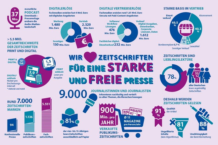 Die Vielfalt des Marktes ist einzigartig: rund 7.000 Zeitschriftenmarken erscheinen in Deutschland – darunter 1.136 Publikumszeitschriften, 5.551 Fachmedien und 94 konfessionelle Titel. Diese publizistische Breite deckt nahezu jedes gesellschaftliche, berufliche und private Interessensfeld ab. Jedes Jahr werden rund 900 Millionen Publikumszeitschriften verkauft – im Schnitt 11 Hefte pro Person. Auch der Pressevertrieb demonstriert Stärke: 49,5 Prozent der Verkäufe erfolgen im Einzelverkauf, 40,3 Prozent über Abonnements, ergänzt durch Lesezirkel (4,7 Prozent), Bordexemplare (0,7 Prozent) und weitere Vertriebswege. Über alle Kanäle hinweg erzielen Zeitschriften eine Gesamtreichweite von über 5,5 Millionen Leserinnen und Lesern pro Erscheinungsintervall in Print und Digital.