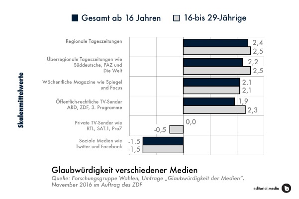 Wenn es um die Glaubwürdigkeit geht, rangiert Social Media weit hinter klassischen Medien. Das zeigt eine neue Studie der Forschungsgruppe Wahlen im Auftrag des ZDF. Die Befragten beurteilen in dieser Untersuchung die Glaubwürdigkeit von Medien auf einer Skala von +5 (sehr glaubwürdig) bis -5 (überhaupt nicht glaubwürdig). Dabei kommen Abo-Zeitungen, Nachrichtenmagazine und öffentlich-rechtliche Fernsehsender auf deutlich positive Werte. Soziale Medien wie Facebook und Twitter bekommen dagegen die Durchschnittsnote -1,5. Offensichtlich glauben die meisten Menschen nicht jeden Humbug, der in sozialen Netzwerken zirkuliert und können satirische Witzchen von Wirklichkeit unterscheiden. Das gilt auch für die Jungen: 16- bis 29-Jährige bewerten Facebook und Twitter genauso wie die Gesamtbevölkerung, während sie den klassischen Medien sogar noch etwas mehr Glaubwürdigkeit beimessen. Wobei diese klassischen Medien ja im Internet und in den sozialen Medien sehr präsent sind.