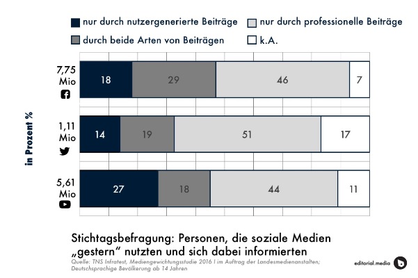 Wenn es darum geht, Informationen über das tagesaktuelle Geschehen zu bekommen, hat das Internet für die deutschsprachige Bevölkerung nur eine nachgeordnete Bedeutung. Zu diesem Ergebnis kommen übereinstimmend die AWA und die Mediengewichtungsstudie der Landesmedienanstalten. Laut Mediengewichtungsstudie nutzen täglich 20,3 Millionen (29 Prozent) das Netz zur Information. 7,75 Millionen (11 Prozent) von ihnen nutzen Facebook zu Informationszwecken. Von diesen wiederum informieren sich drei Viertel durch "professionelle Beiträge" – also im Wesentlichen durch Infos, die Journalisten klassischer Medien erstellen. 46 Prozent greifen ausschließlich auf Beiträge von Profis zurück, weitere 29 Prozent nutzen daneben auch "user generated content".